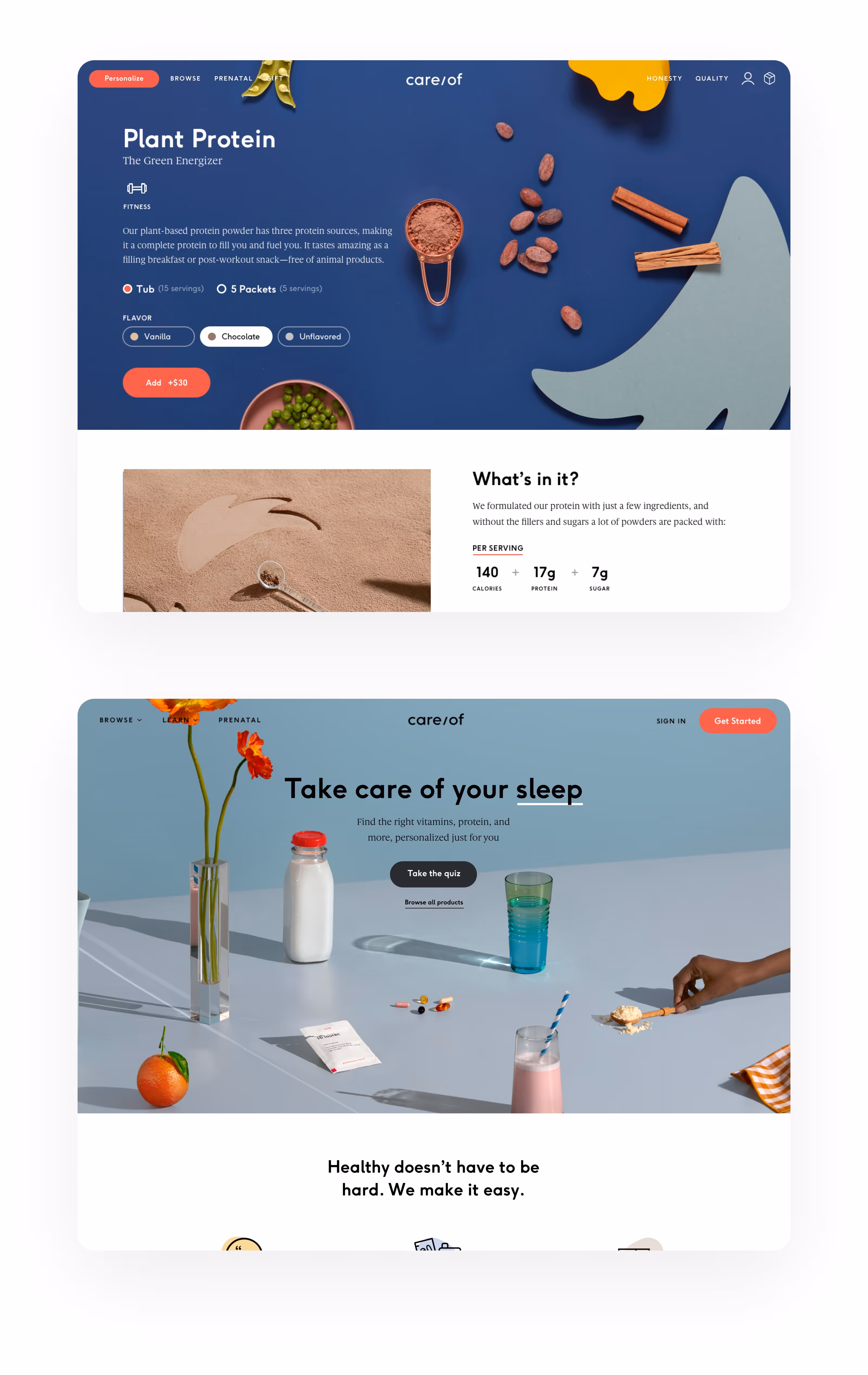 Care/of Protein marked the brand’s first major category expansion since its flagship vitamin packs, extending personalization into daily nutrition. We built the line around two form factors, full-size tubs for home use and single-serve sachets for on-the-go routines, and offered both whey and plant-based formulas in two flavors each. The system was designed to feel clean, modern, and unmistakably Care/of, giving customers a seamless way to elevate their wellness rituals.