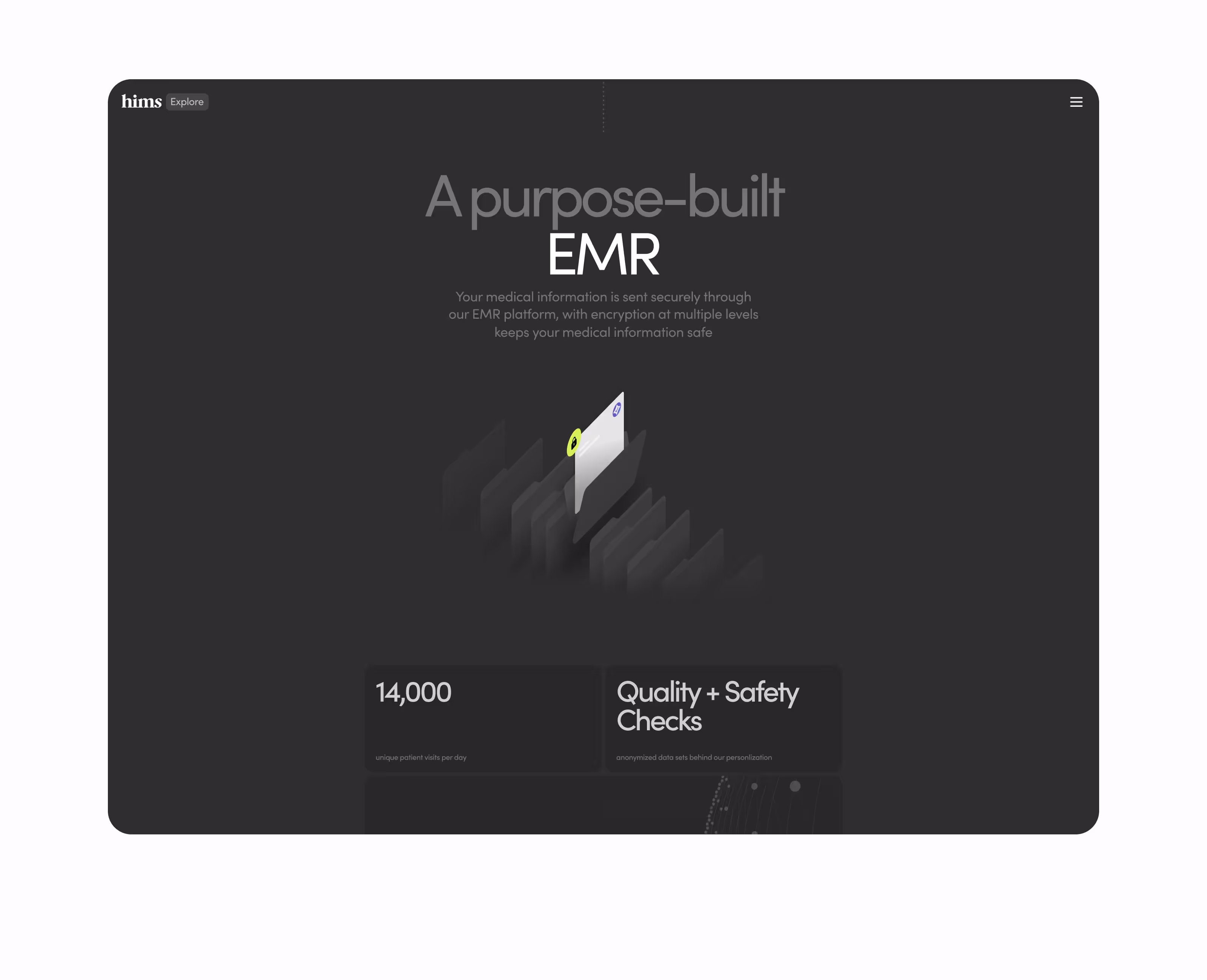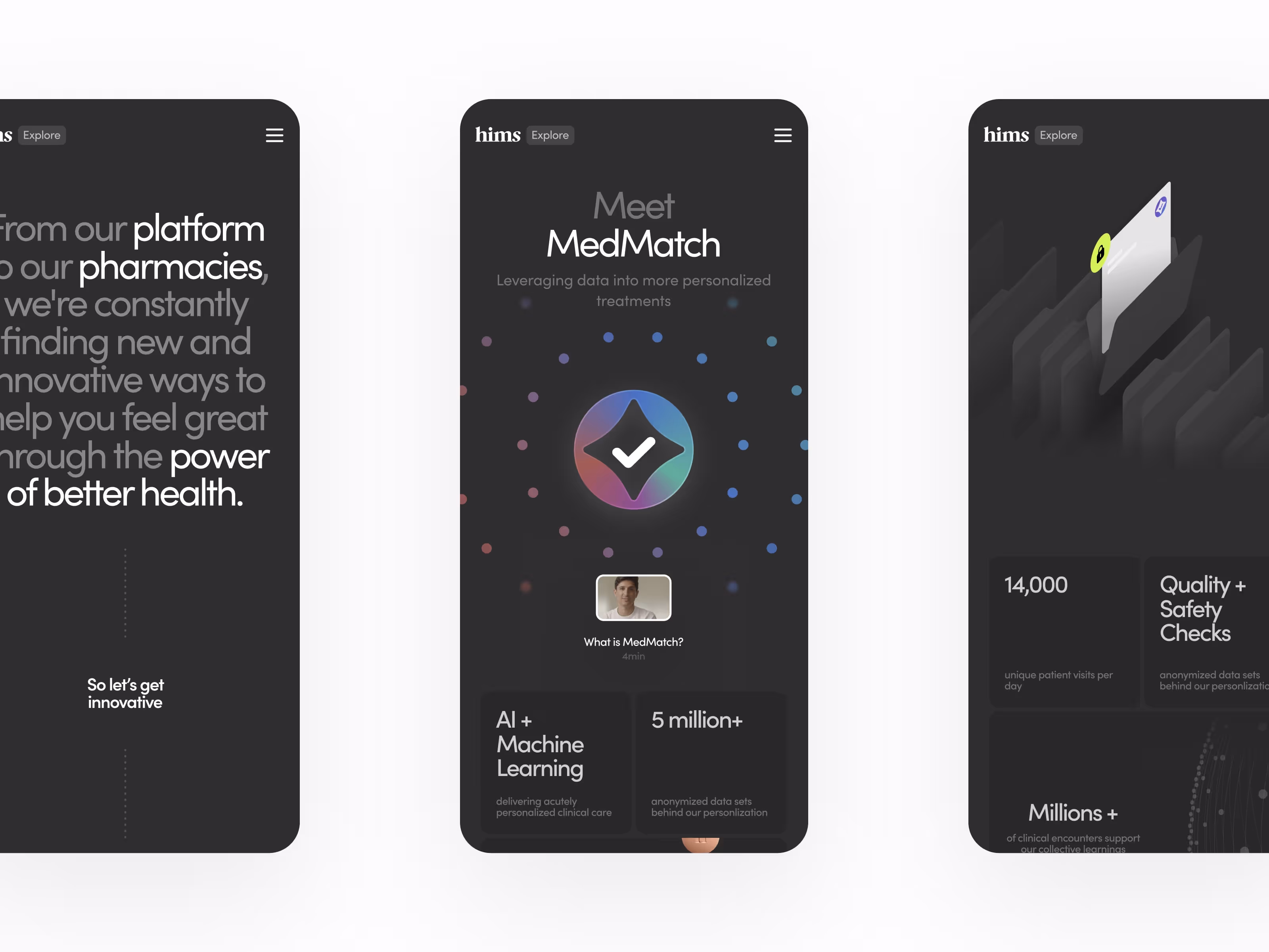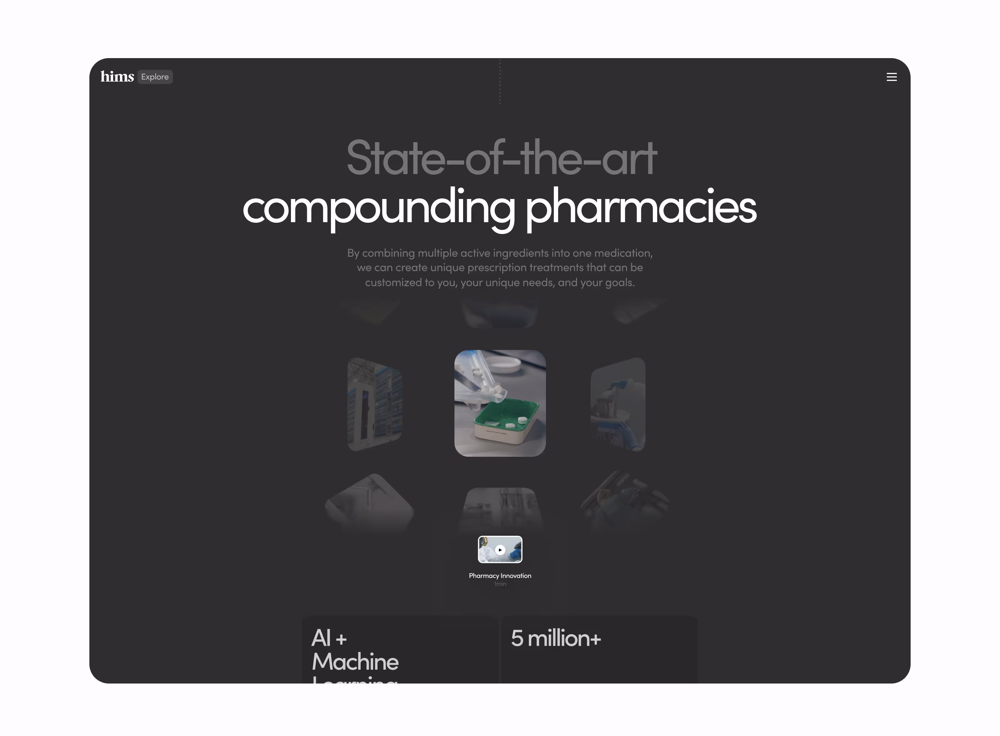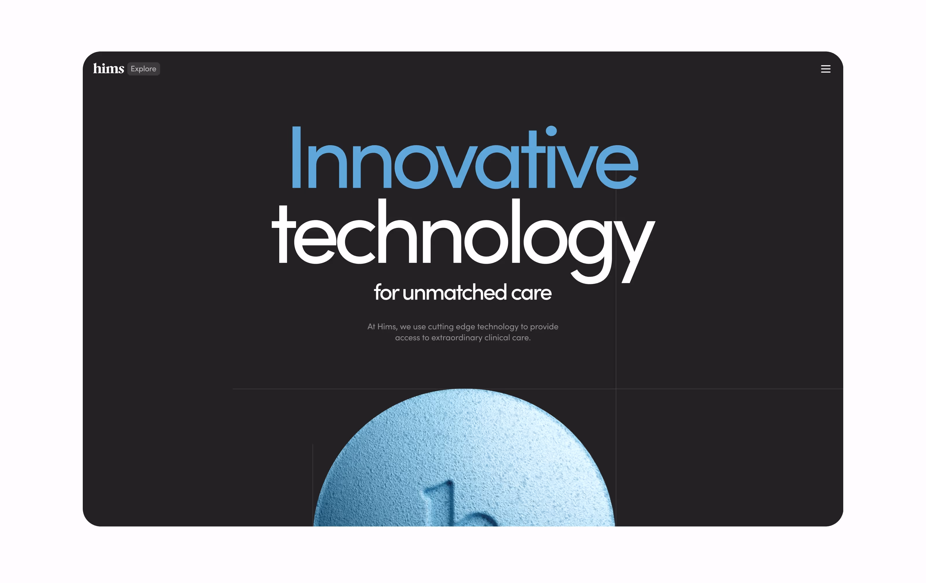 I led the design of the Hims & Hers Innovation page, shaping it as a tone-setting moment for the brand. Subtle Rive animations supported the story, adding just enough movement to bring the company’s technology to life without overwhelming the message. The motion system helped translate complex tools like clinical workflows, personalized treatment engines, and real-time pharmacy operations into visuals that feel intuitive and alive. By blending interaction, animation, and thoughtful pacing, the page gives people a clearer, more engaging view of how the company builds modern, accessible healthcare behind the scenes.